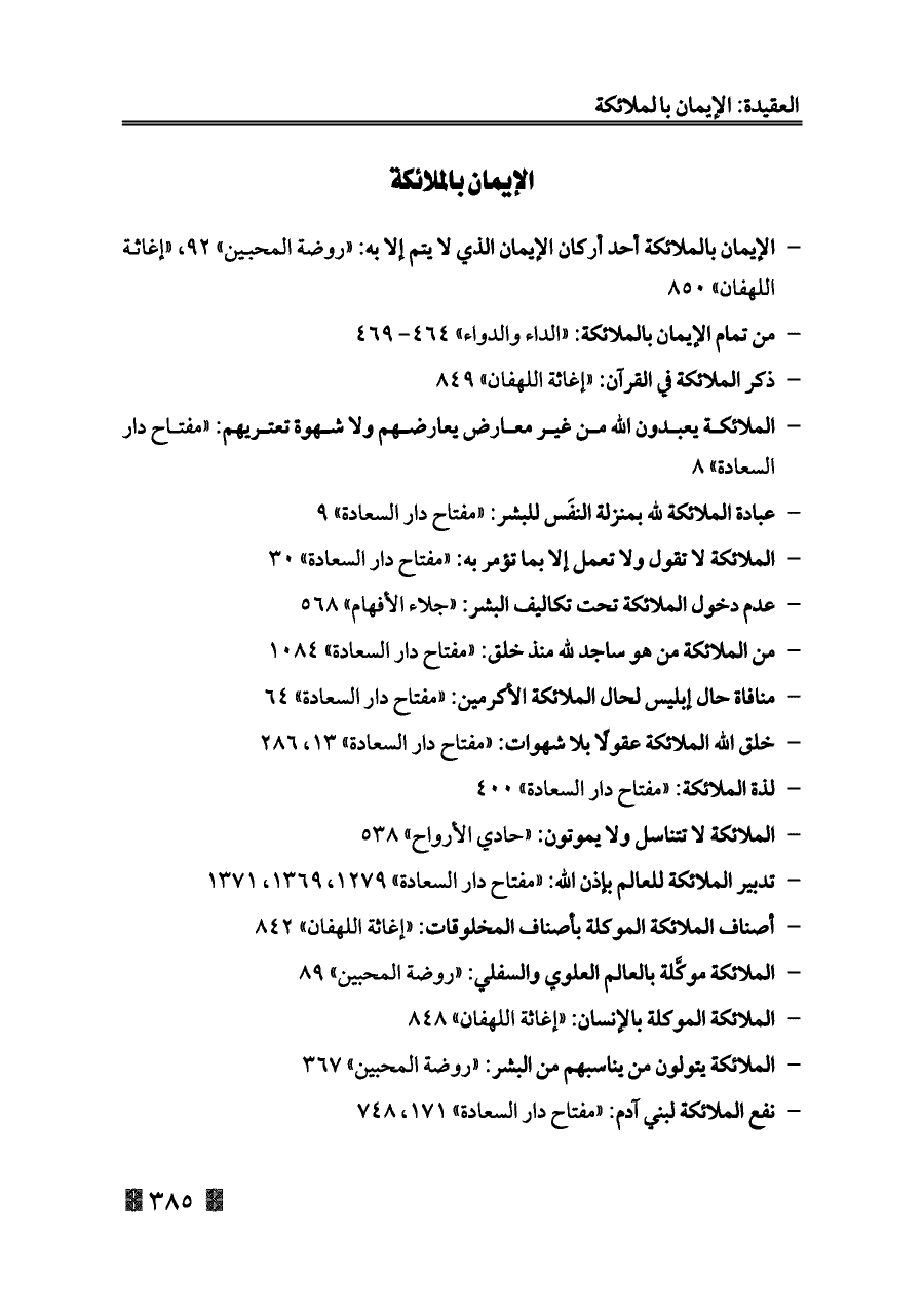 - الإيمان بالملائكة أحد أركان الإيمان الذي لا يتم إلا به: «روضة المحبين» ٩٢، «إغاثة اللهفان» ٨٥٠