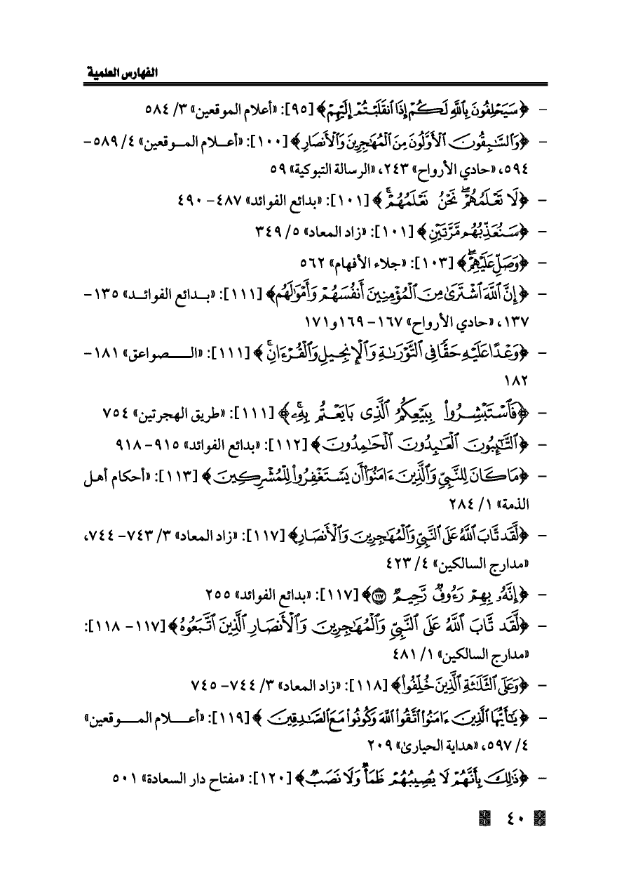 - {إِنَّ اللَّهَ اشْتَرَى مِنَ الْمُؤْمِنِينَ أَنْفُسَهُمْ وَأَمْوَالَهُمْ} [١١١]: «بدائع الفوائد» ١٣٥ - ١٣٧، «حادي الأرواح» ١٦٧ - ١٦٩ و ١٧١