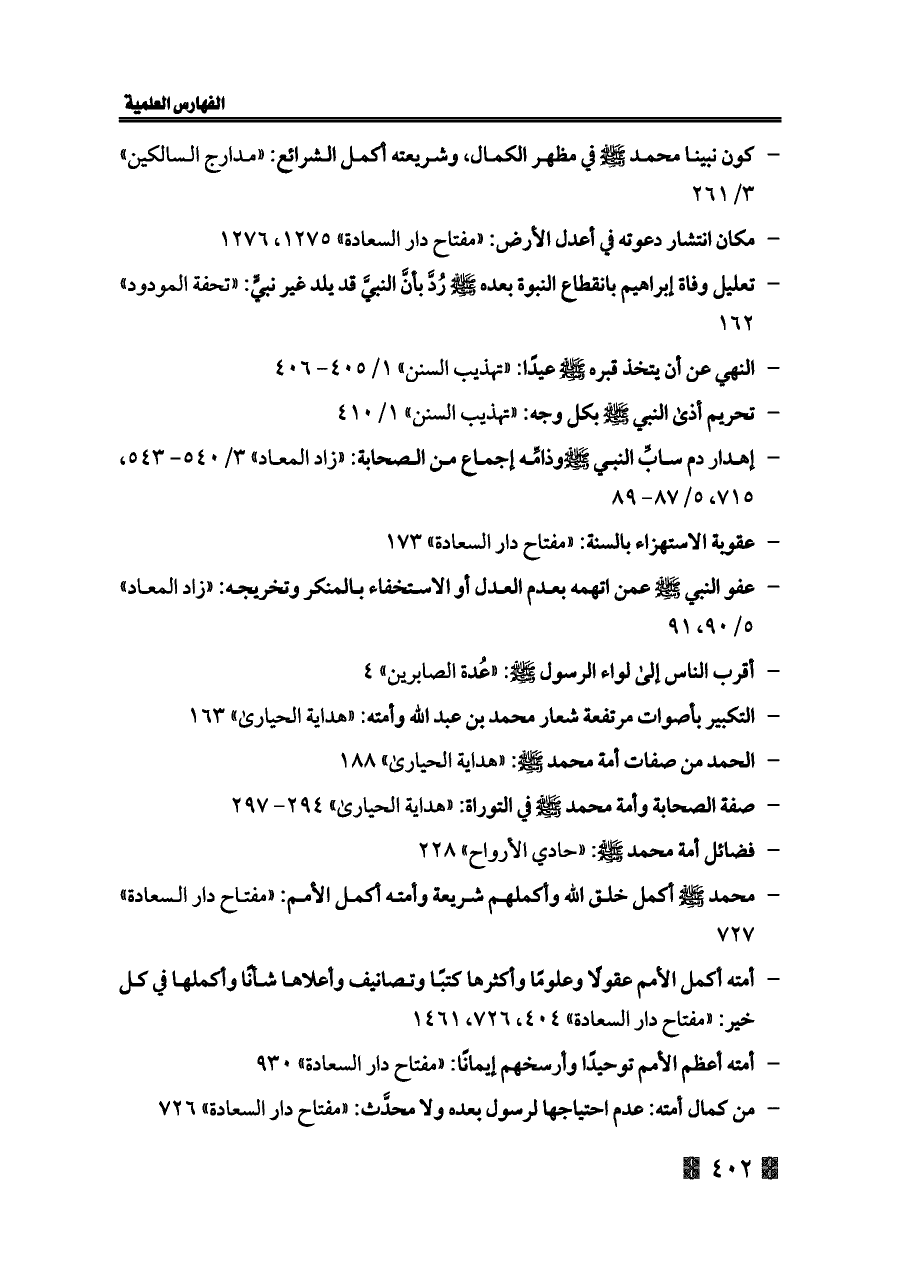- محمد - صلى الله عليه وسلم - أكمل خلق الله وأكملهم شريعة وأمته أكمل الأمم: «مفتاح دار السعادة» ٧٢٧