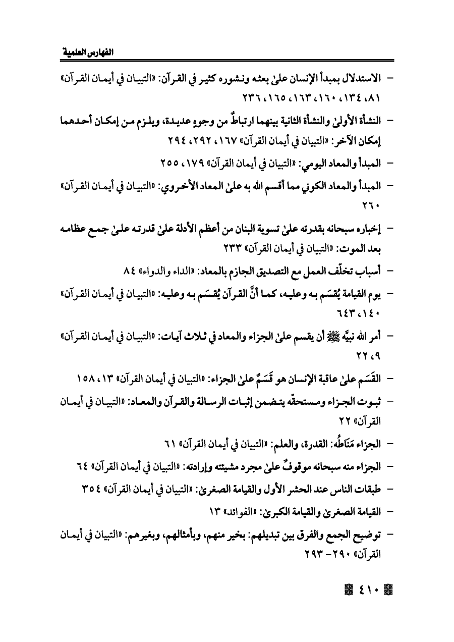 - الاستدلال بمبدأ الإنسان على بعثه ونشوره كثير في القرآن: «التبيان في أيمان القرآن» ٨١، ١٣٤، ١٦٠، ١٦٣، ١٦٥، ٢٣٦
