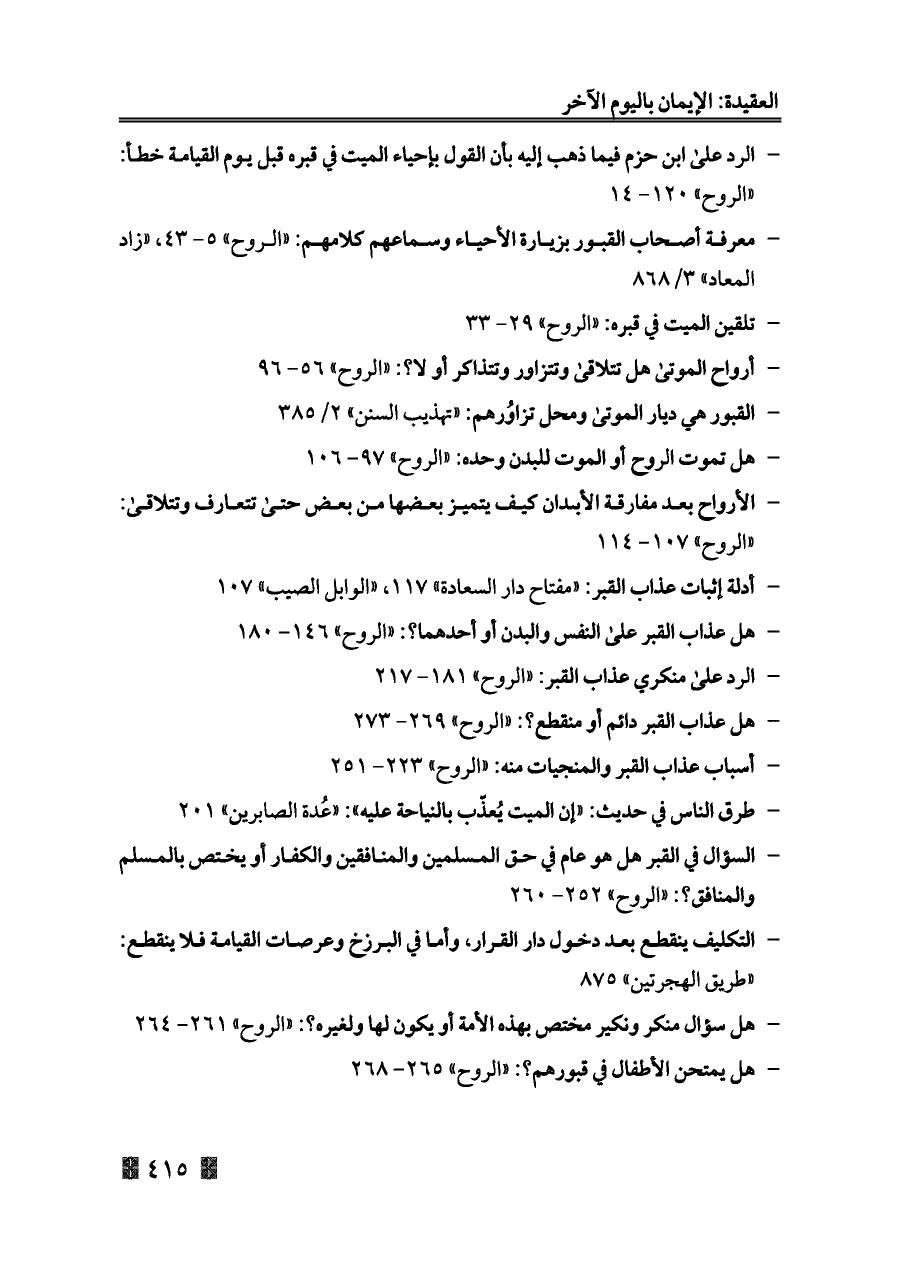 - معرفة أصحاب القبور بزيارة الأحياء وسماعهم كلامهم: «الروح» ٥ - ٤٣، «زاد المعاد» ٣/ ٨٦٨