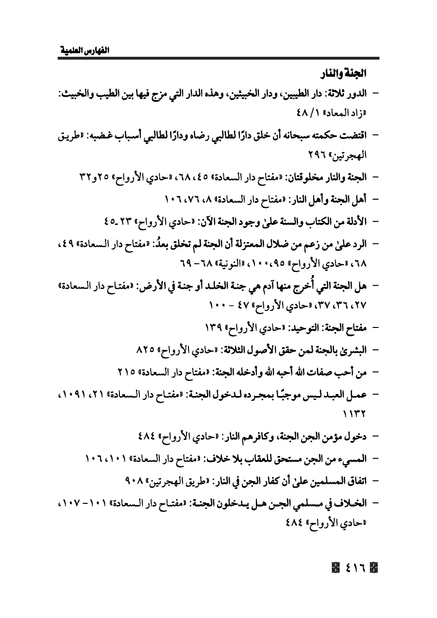 - الجنة والنار مخلوقتان: «مفتاح دار السعادة» ٤٥، ٦٨، «حادي الأرواح» ٢٥ و ٣٢
