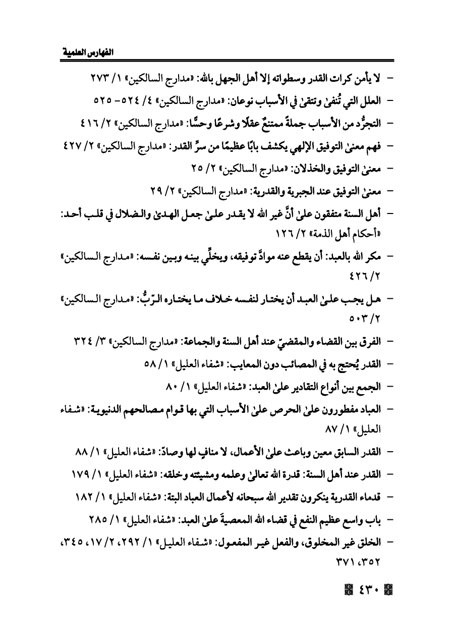 - القدر عند أهل السنة: قدرة الله تعالى وعلمه ومشيئته وخلقه: «شفاء العليل» ١/ ١٧٩