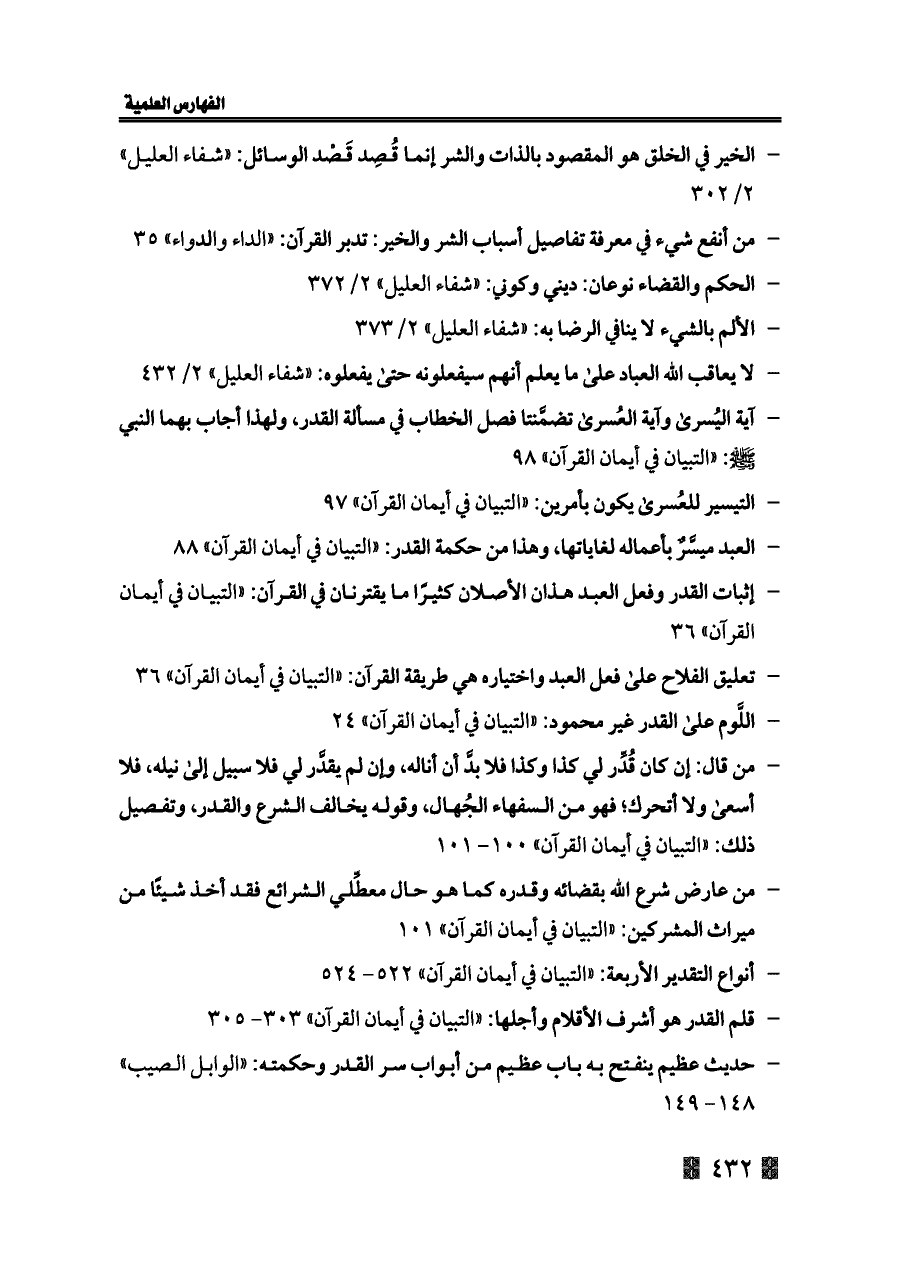 - إثبات القدر وفعل العبد هذان الأصلان كثيرًا ما يقترنان في القرآن: «التبيان في أيمان القرآن» ٣٦