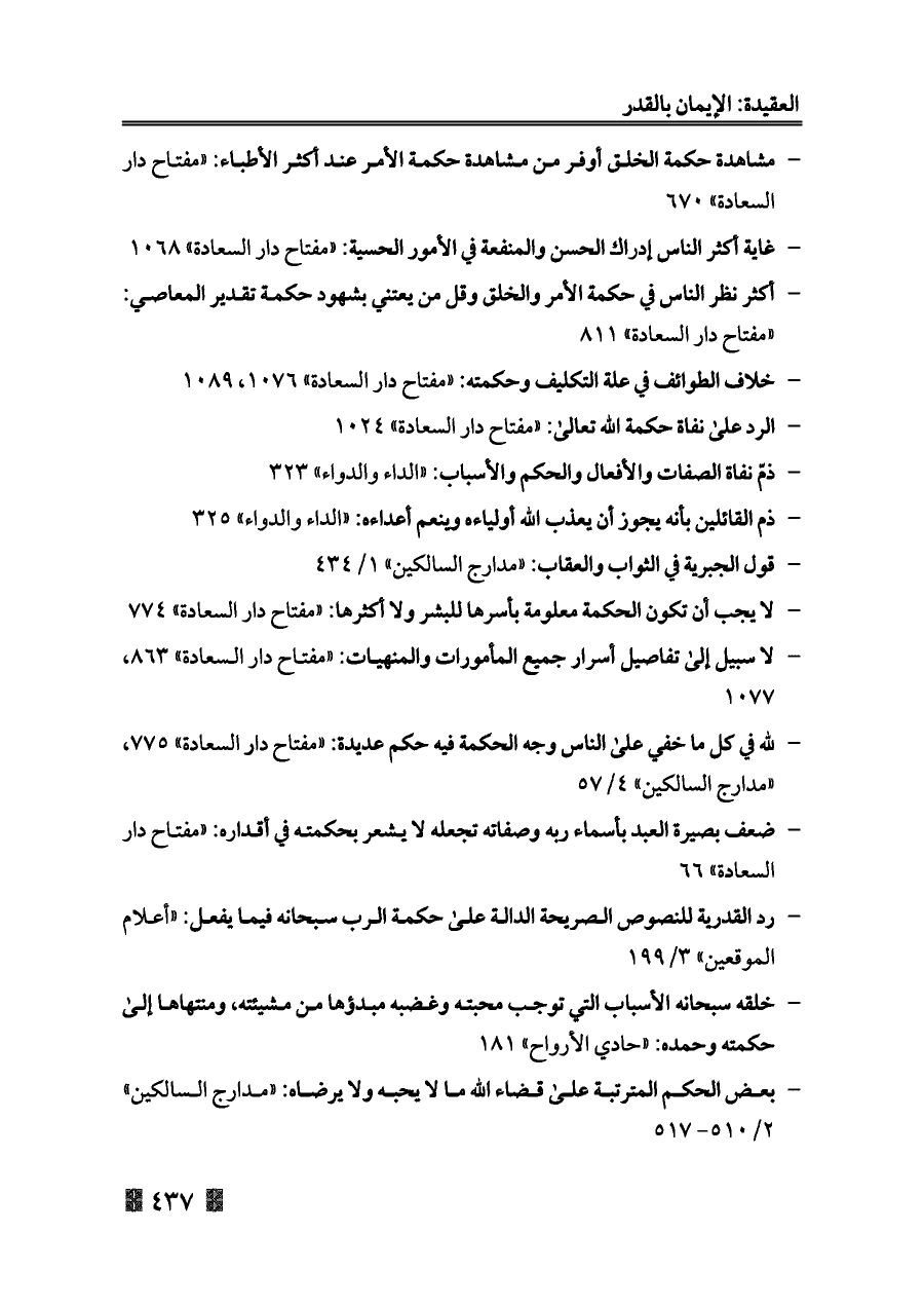- رد القدرية للنصوص الصريحة الدالة على حكمة الرب سبحانه فيما يفعل: «أعلام الموقعين» ٣/ ١٩٩