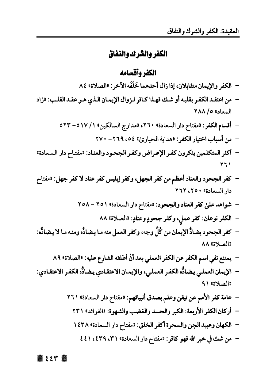 - أقسام الكفر: «مفتاح دار السعادة» ٢٦٠، «مدارج السالكين» ١/ ٥١٧ - ٥٢٣