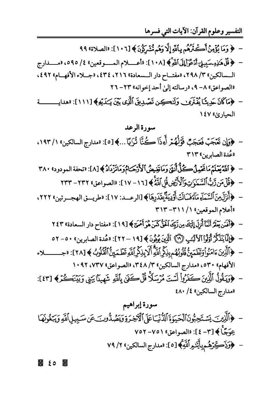 - {قُلْ هَذِهِ سَبِيلِي أَدْعُو إِلَى اللَّهِ} [١٠٨]: «أعلام الموقعين» ٤/ ٥٩٥، «مدارج السالكين» ٣/ ٢٩٨، «مفتاح دار السعادة» ٢١٦، ٤٣٤، «جلاء الأفهام» ٤٩٢، «الصواعق» ٨ - ٩، «رسالته إلى أحد إخوانه» ٢٣ - ٢٦