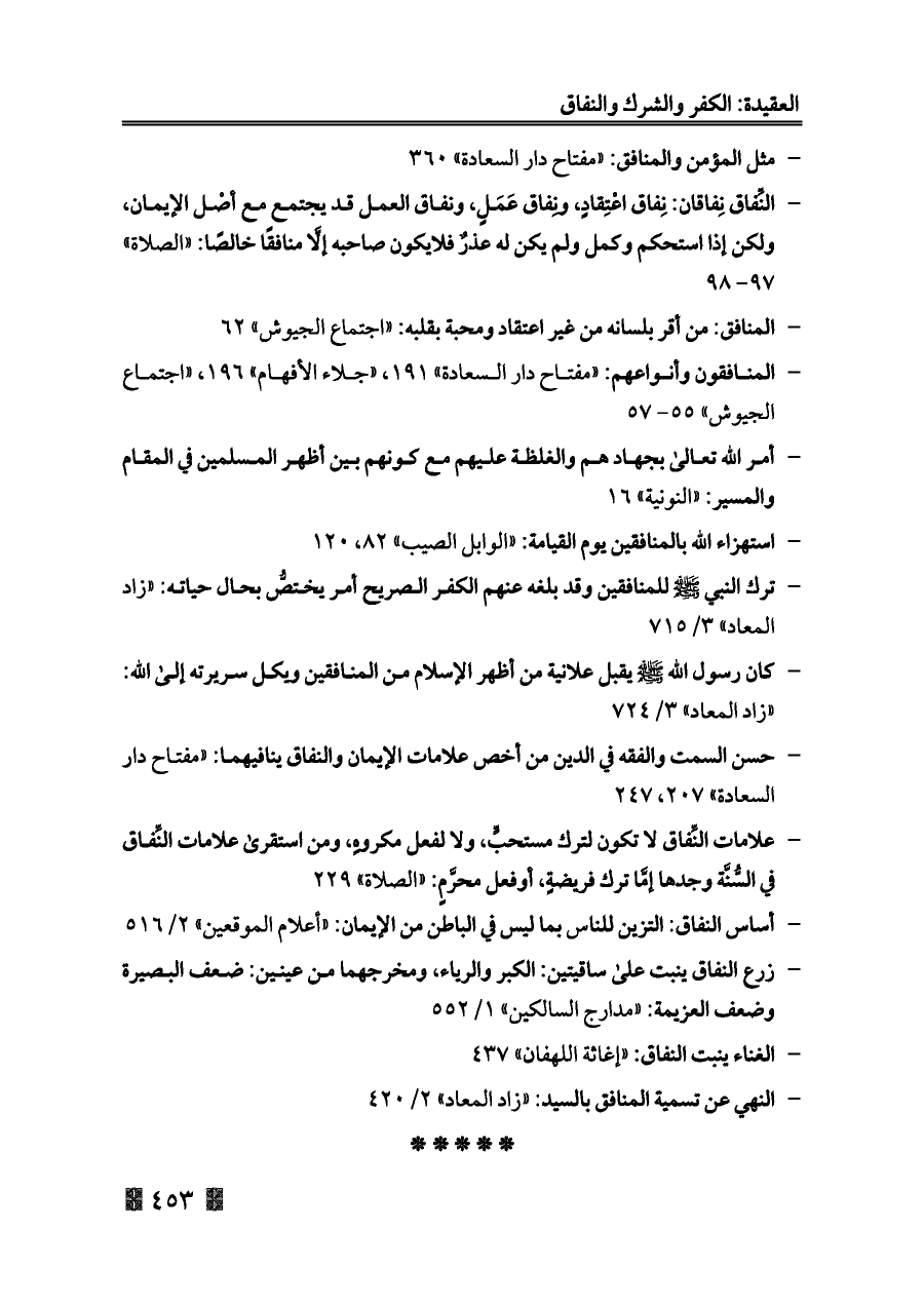 - المنافقون وأنواعهم: «مفتاح دار السعادة» ١٩١، «جلاء الأفهام» ١٩٦، «اجتماع الجيوش» ٥٥ - ٥٧