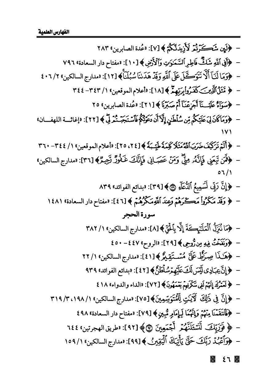 - {إِنَّ عِبَادِي لَيْسَ لَكَ عَلَيْهِمْ سُلْطَانٌ} [٤٢]: «بدائع الفوائد» ٩٣٩