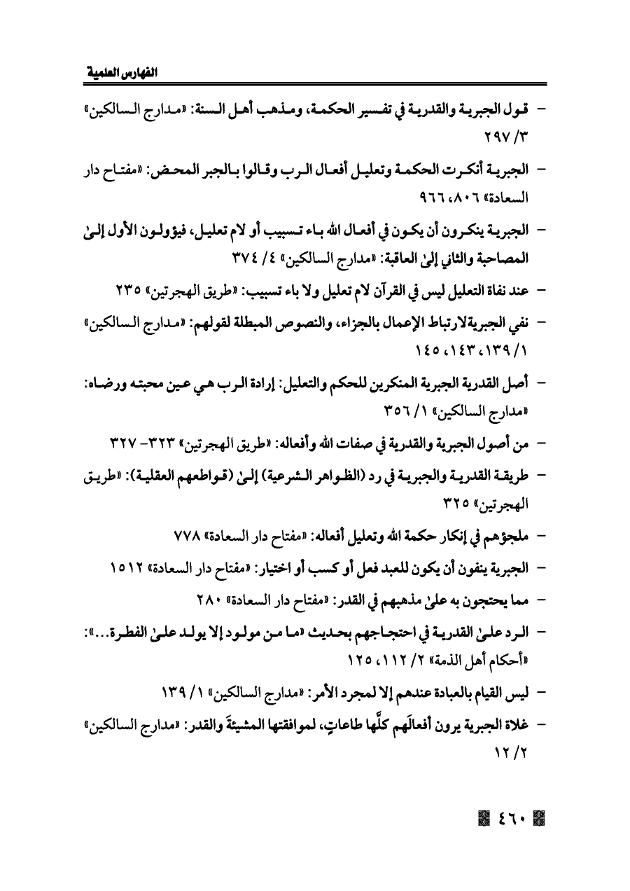 - نفي الجبريةلارتباط الإعمال بالجزاء، والنصوص المبطلة لقولهم: «مدارج السالكين» ١/ ١٣٩، ١٤٣، ١٤٥