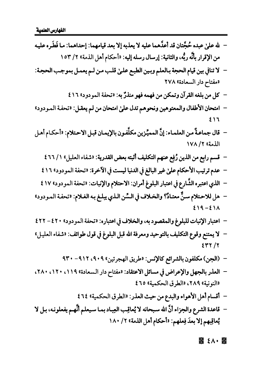 - العذر بالجهل والإعراض في مسائل الاعتقاد: «مفتاح دار السعادة» ١١٩، ١٢٠، ٢٨٠، «النونية» ٢٨٩، «الطرق الحكمية» ٤٦٥