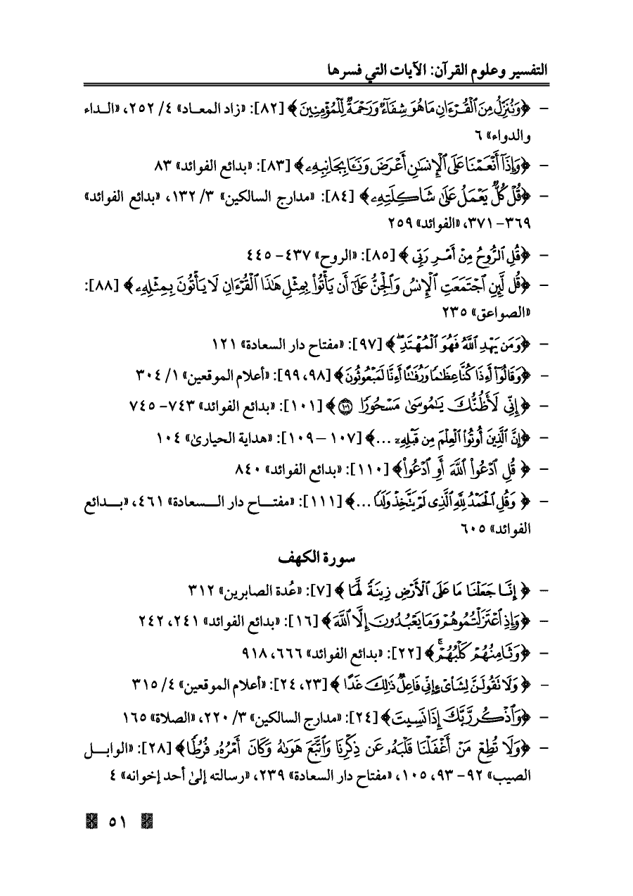 - {وَلَا تُطِعْ مَنْ أَغْفَلْنَا قَلْبَهُ عَنْ ذِكْرِنَا وَاتَّبَعَ هَوَاهُ وَكَانَ أَمْرُهُ فُرُطًا} [٢٨]: «الوابل الصيب» ٩٢ - ٩٣، ١٠٥، «مفتاح دار السعادة» ٢٣٩، «رسالته إلى أحد إخوانه» ٤