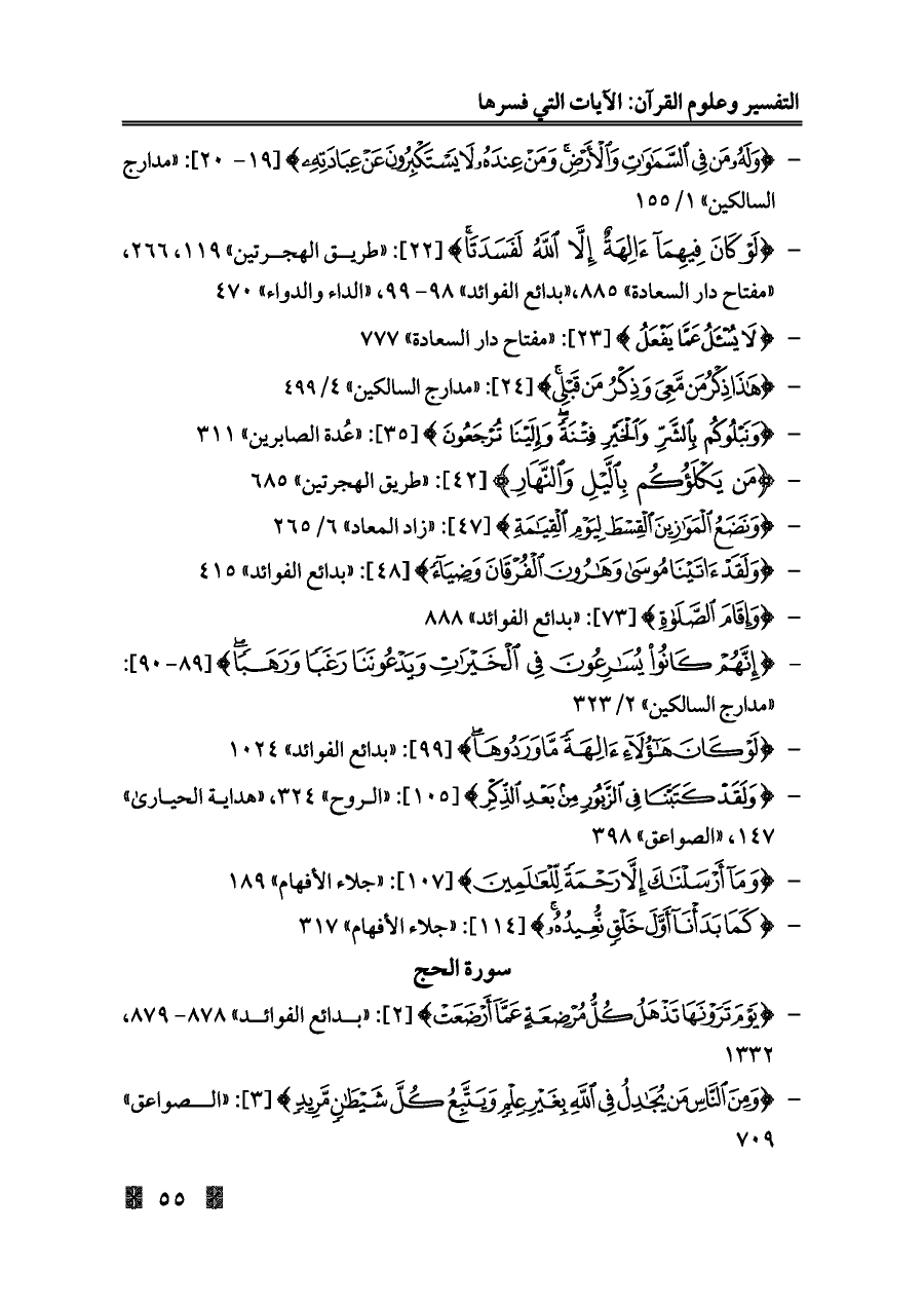 - {وَلَهُ مَنْ فِي السَّمَاوَاتِ وَالْأَرْضِ وَمَنْ عِنْدَهُ لَا يَسْتَكْبِرُونَ عَنْ عِبَادَتِهِ} [١٩ - ٢٠]: «مدارج السالكين» ١/ ١٥٥
