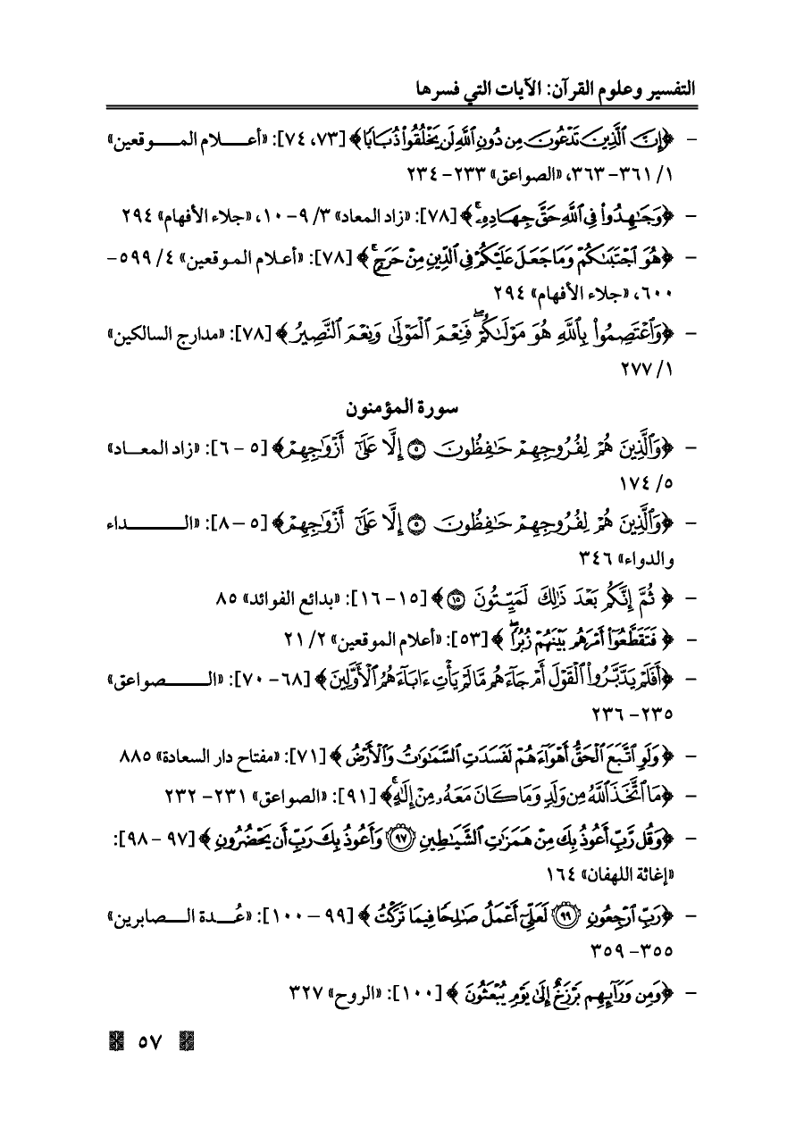 - {وَاعْتَصِمُوا بِاللَّهِ هُوَ مَوْلَاكُمْ فَنِعْمَ الْمَوْلَى وَنِعْمَ النَّصِيرُ} [٧٨]: «مدارج السالكين» ١/ ٢٧٧