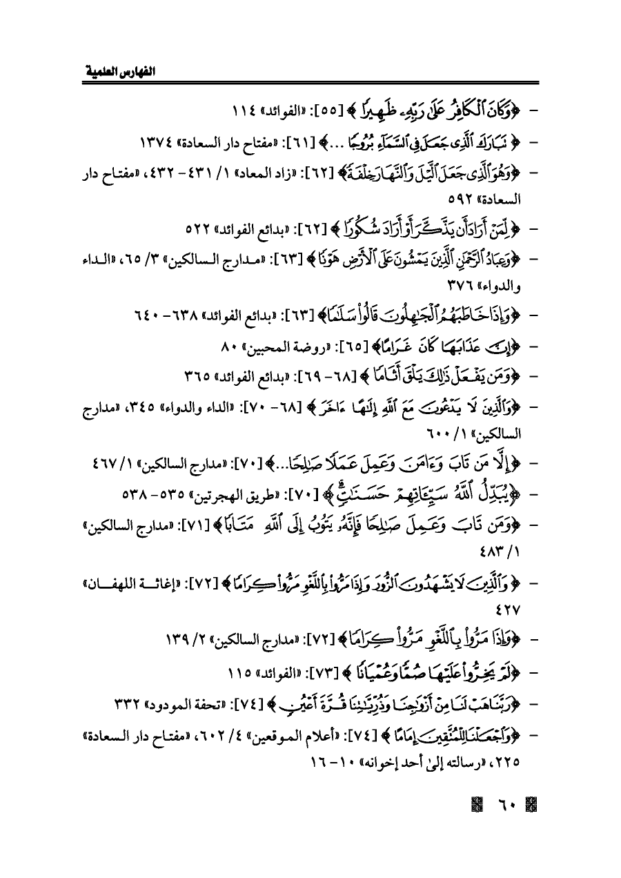 - {وَعِبَادُ الرَّحْمَنِ الَّذِينَ يَمْشُونَ عَلَى الْأَرْضِ هَوْنًا} [٦٣]: «مدارج السالكين» ٣/ ٦٥، «الداء والدواء» ٣٧٦
