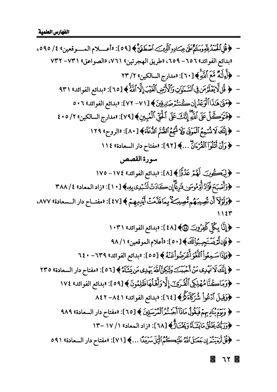 - {قُلِ الْحَمْدُ لِلَّهِ وَسَلَامٌ عَلَى عِبَادِهِ الَّذِينَ اصْطَفَى} [٥٩]: «أعلام الموقعين» ٤/ ٥٩٥، «بدائع الفوائد» ٦٥٦ - ٦٥٩، «طريق الهجرتين» ٧٦١، «الصواعق» ٧٣١ - ٧٣٢