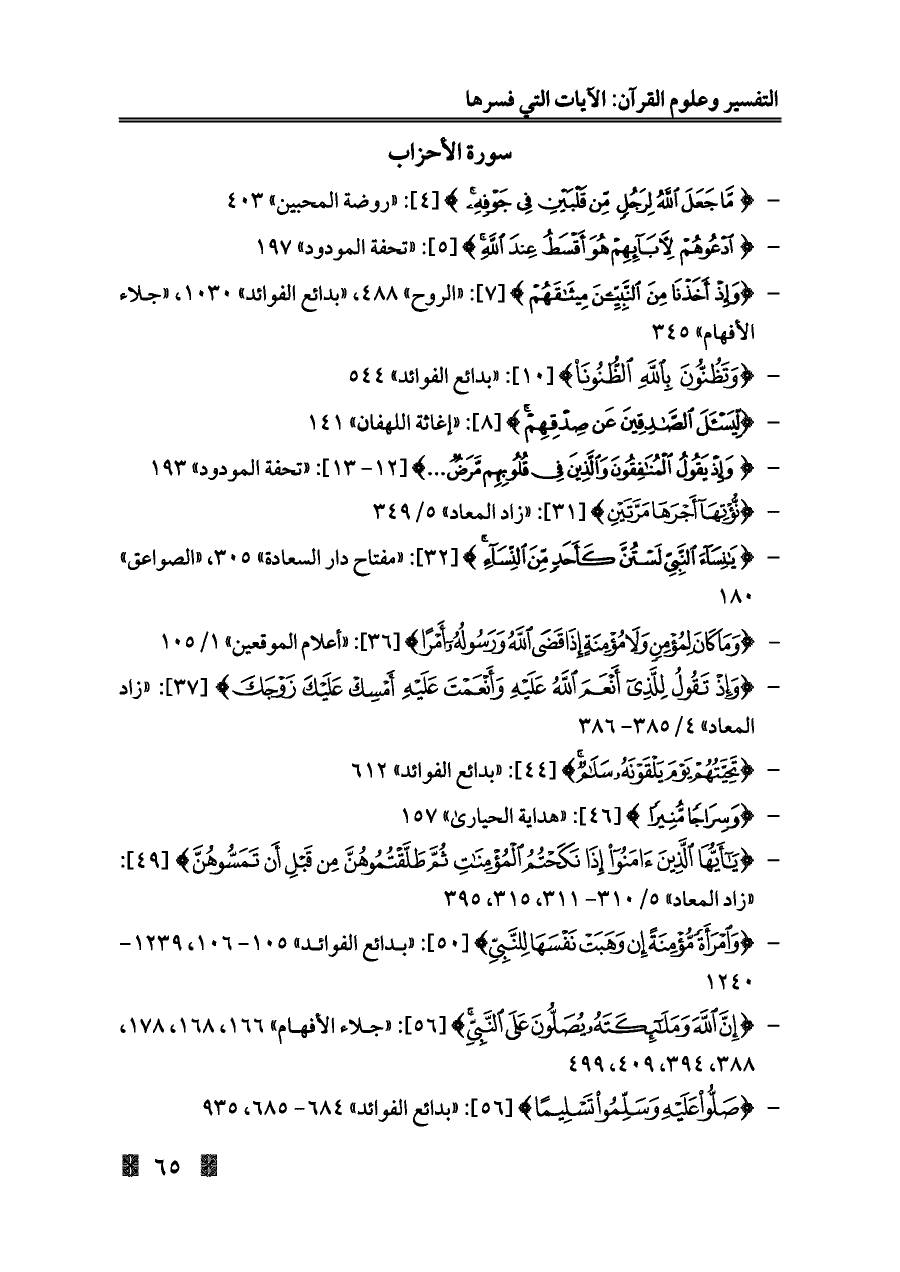 - {صَلُّوا عَلَيْهِ وَسَلِّمُوا تَسْلِيمًا} [٥٦]: «بدائع الفوائد» ٦٨٤ - ٦٨٥، ٩٣٥