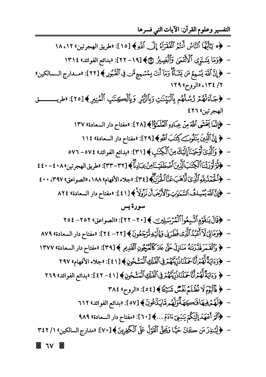- {إِنَّ الَّذِينَ يَتْلُونَ كِتَابَ اللَّهِ} [٢٩]: «مفتاح دار السعادة» ١١٤