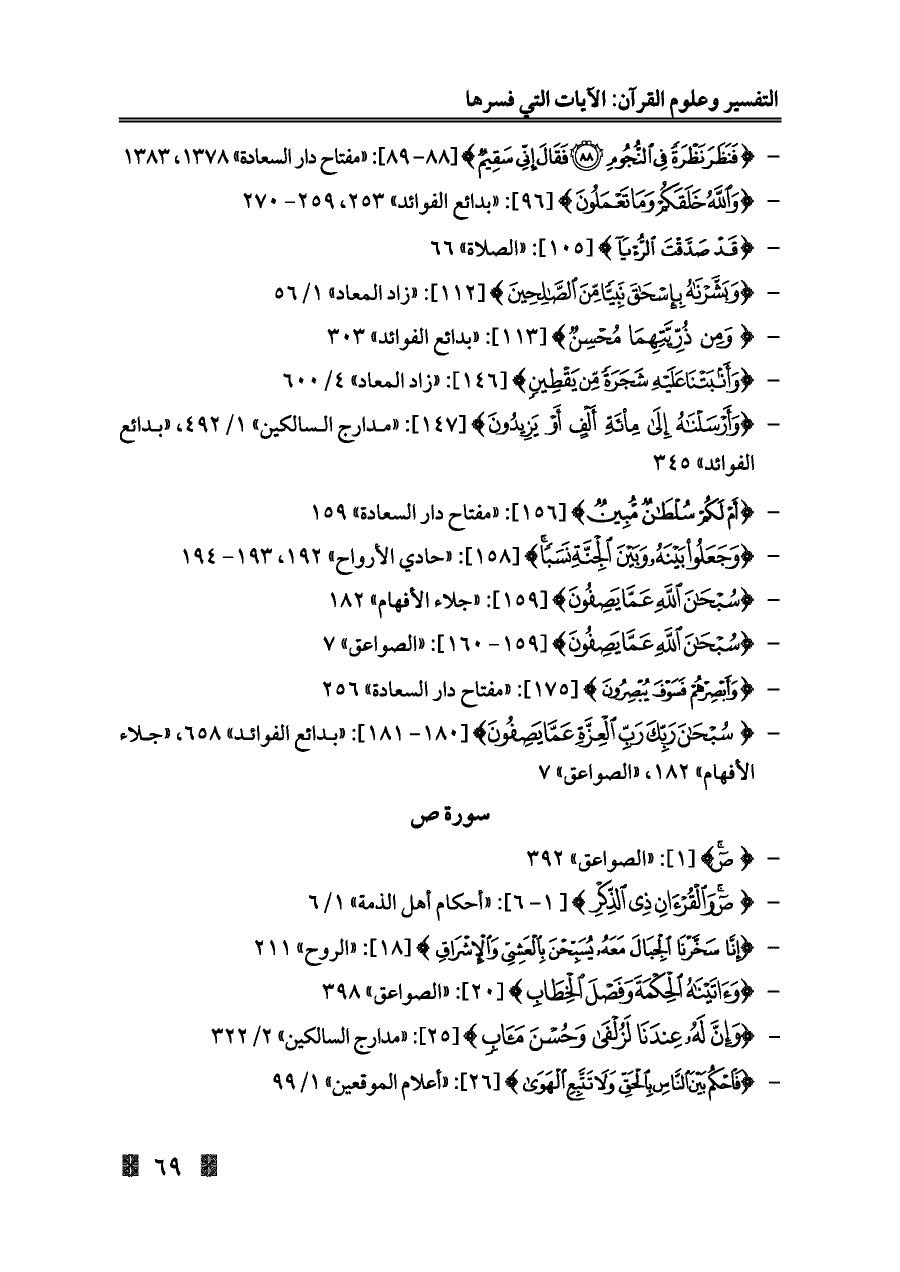 - {سُبْحَانَ رَبِّكَ رَبِّ الْعِزَّةِ عَمَّا يَصِفُونَ} [١٨٠ - ١٨١]: «بدائع الفوائد» ٦٥٨، «جلاء الأفهام» ١٨٢، «الصواعق» ٧