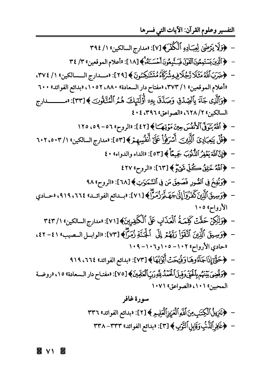 - {قُلْ يَاعِبَادِيَ الَّذِينَ أَسْرَفُوا عَلَى أَنْفُسِهِمْ} [٥٣]: «مدارج السالكين» ١/ ٥٠٣، ٦٠٢