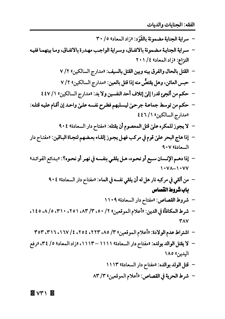 - لا يقتل الوالد بولده: «مفتاح دار السعادة» ١١١١ - ١١١٣، «زاد المعاد» ٥/ ٣٤، «رفع اليدين» ١٨٥