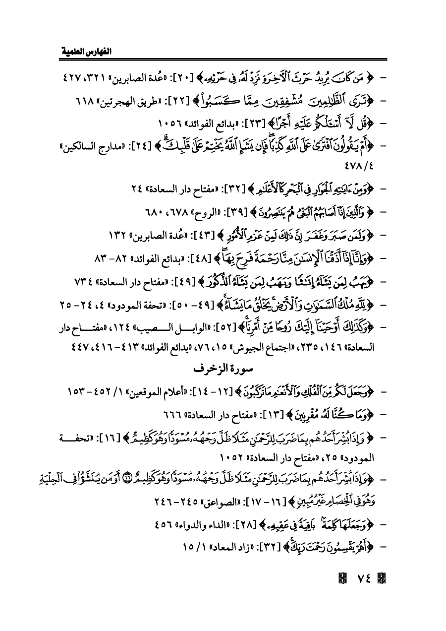 - {وَكَذَلِكَ أَوْحَيْنَا إِلَيْكَ رُوحًا مِنْ أَمْرِنَا} [٥٢]: «الوابل الصيب» ١٢٤، «مفتاح دار السعادة» ١٤٦، ٢٣٥، «اجتماع الجيوش» ١٥، ٧٦، «بدائع الفوائد» ٤١٣ - ٤١٦، ٤٤٧