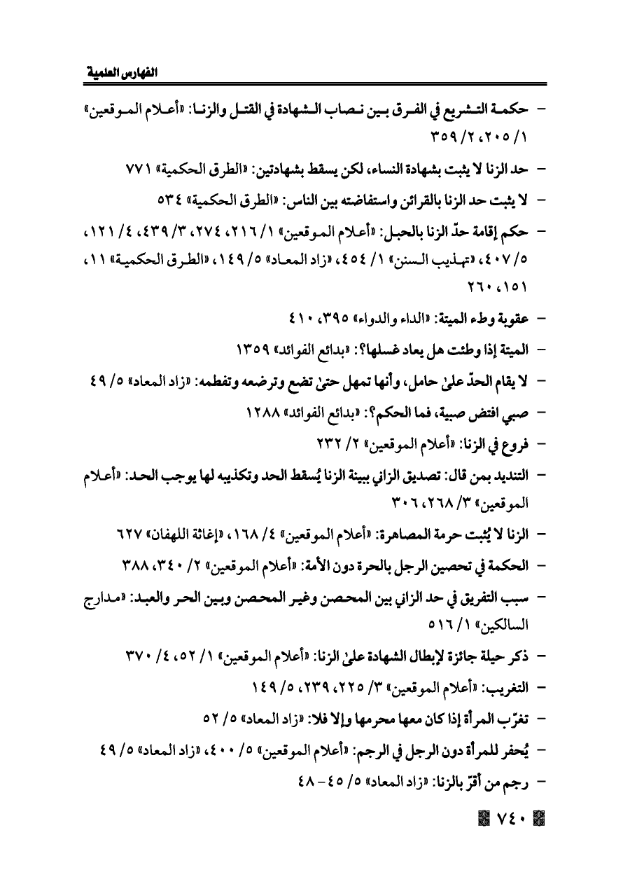 - حكم إقامة حدّ الزنا بالحبل: «أعلام الموقعين» ١/ ٢١٦، ٢٧٤، ٣/ ٤٣٩، ٤/ ١٢١، ٥/ ٤٠٧، «تهذيب السنن» ١/ ٤٥٤، «زاد المعاد» ٥/ ١٤٩، «الطرق الحكمية» ١١، ١٥١، ٢٦٠