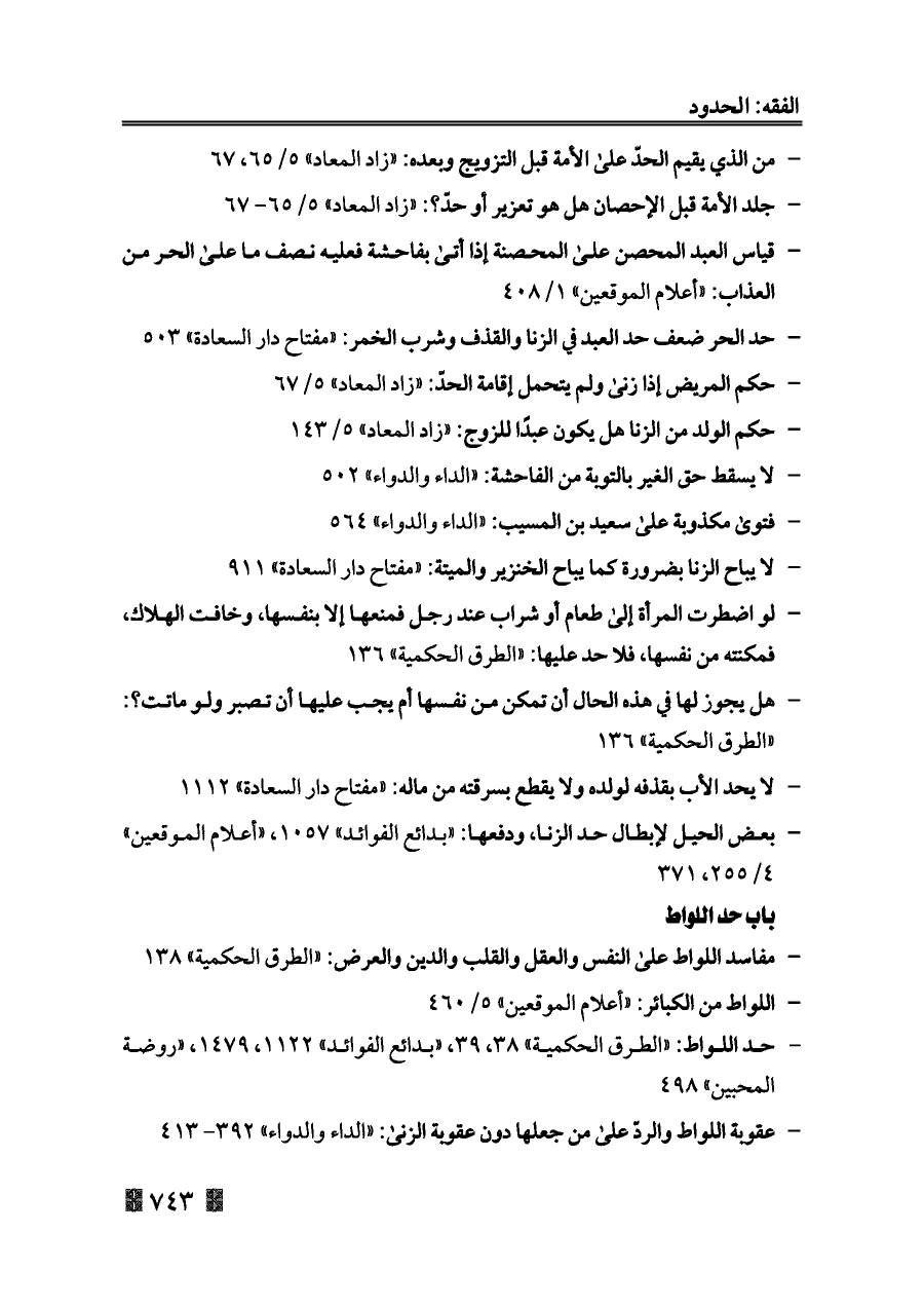 - حد اللواط: «الطرق الحكمية» ٣٨، ٣٩، «بدائع الفوائد» ١١٢٢، ١٤٧٩، «روضة المحبين» ٤٩٨