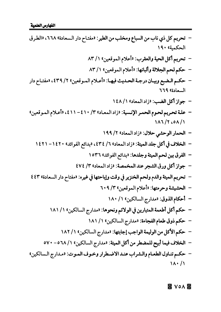 - تحريم كل ذي ناب من السباع ومخلب من الطير: «مفتاح دار السعادة» ٦٦٨، «الطرق الحكمية» ١٩٠