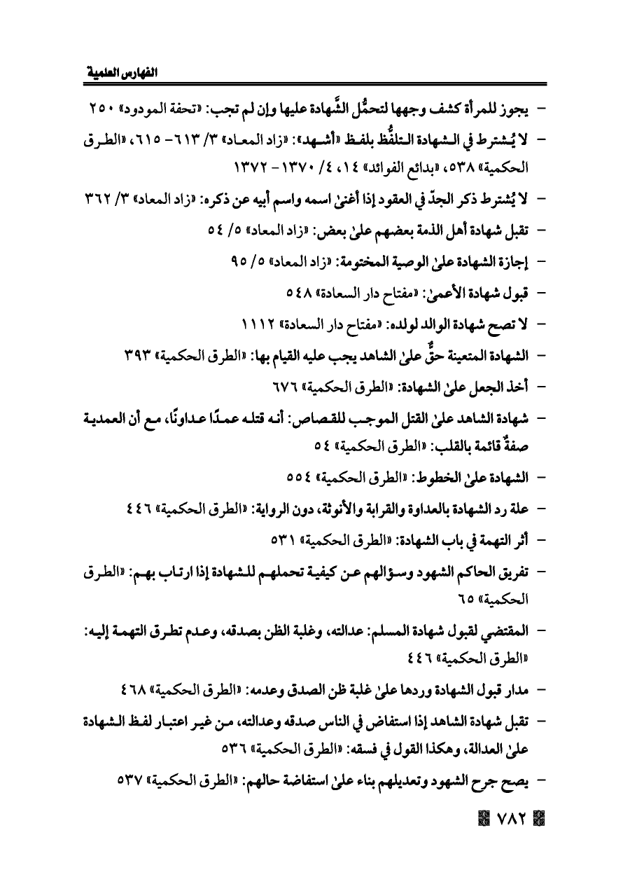 - علة رد الشهادة بالعداوة والقرابة والأنوثة، دون الرواية: «الطرق الحكمية» ٤٤٦
