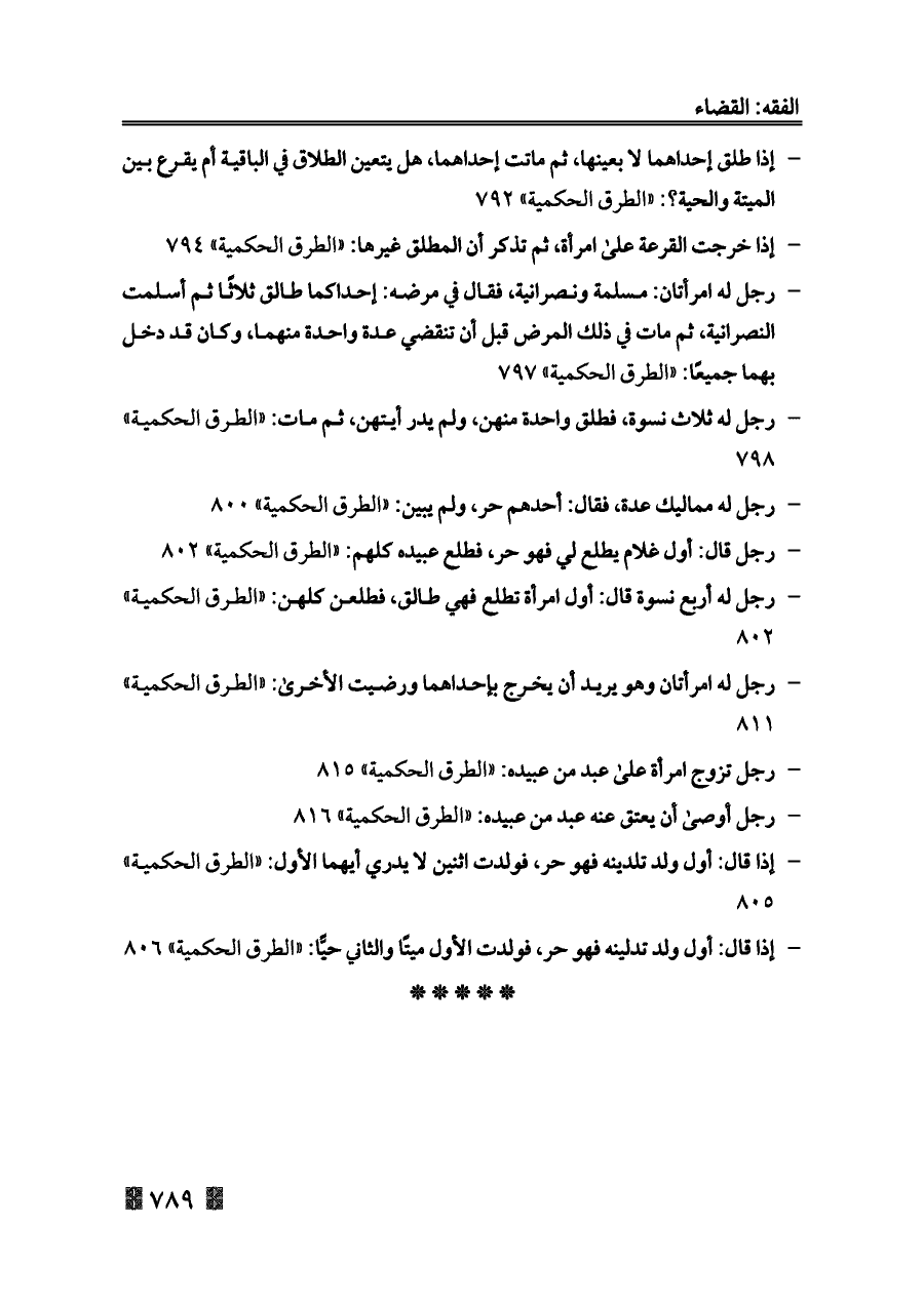 - رجل له ثلاث نسوة، فطلق واحدة منهن، ولم يدر أيتهن، ثم مات: «الطرق الحكمية» ٧٩٨