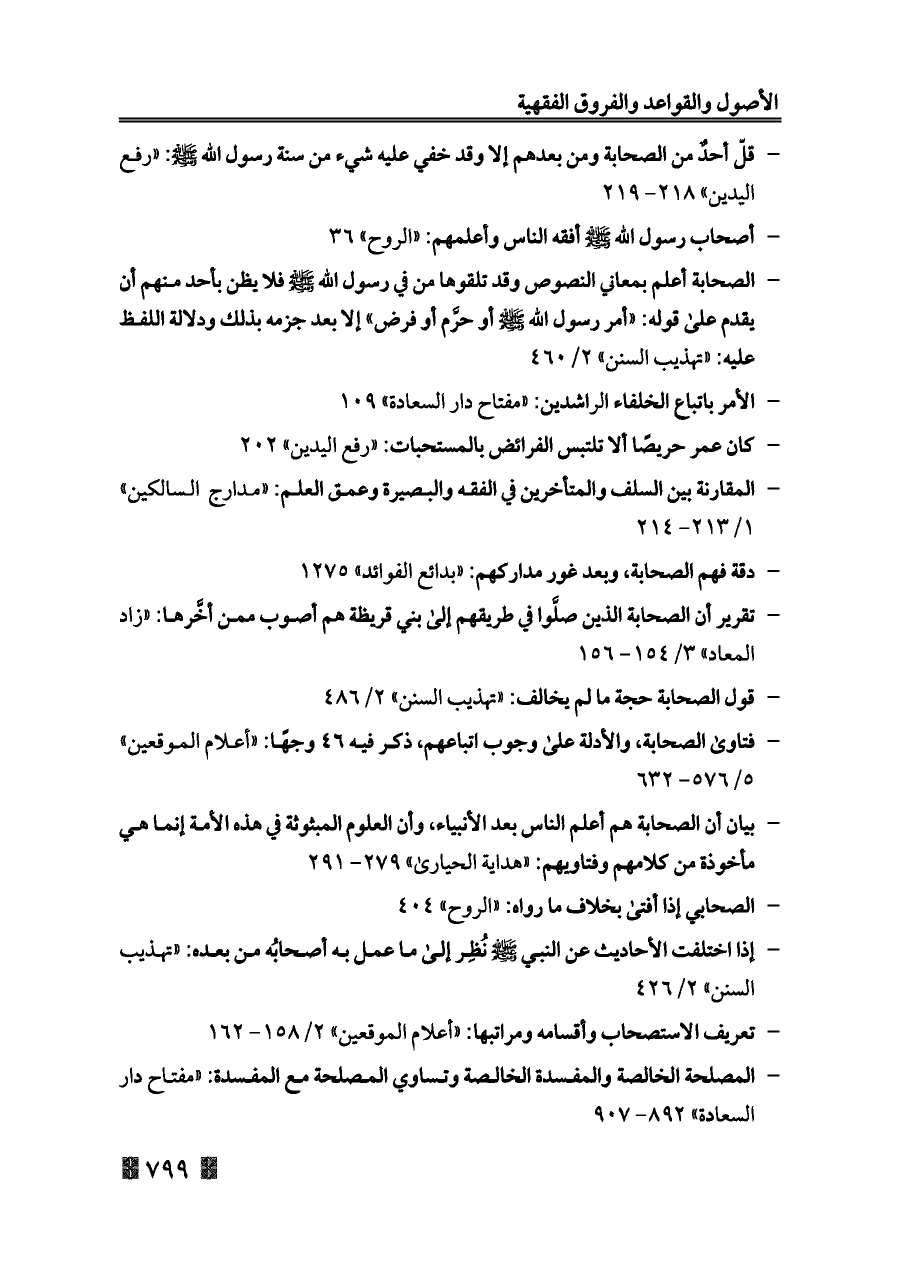 - بيان أن الصحابة هم أعلم الناس بعد الأنبياء، وأن العلوم المبثوثة في هذه الأمة إنما هي مأخوذة من كلامهم وفتاويهم: «هداية الحيارى» ٢٧٩ - ٢٩١