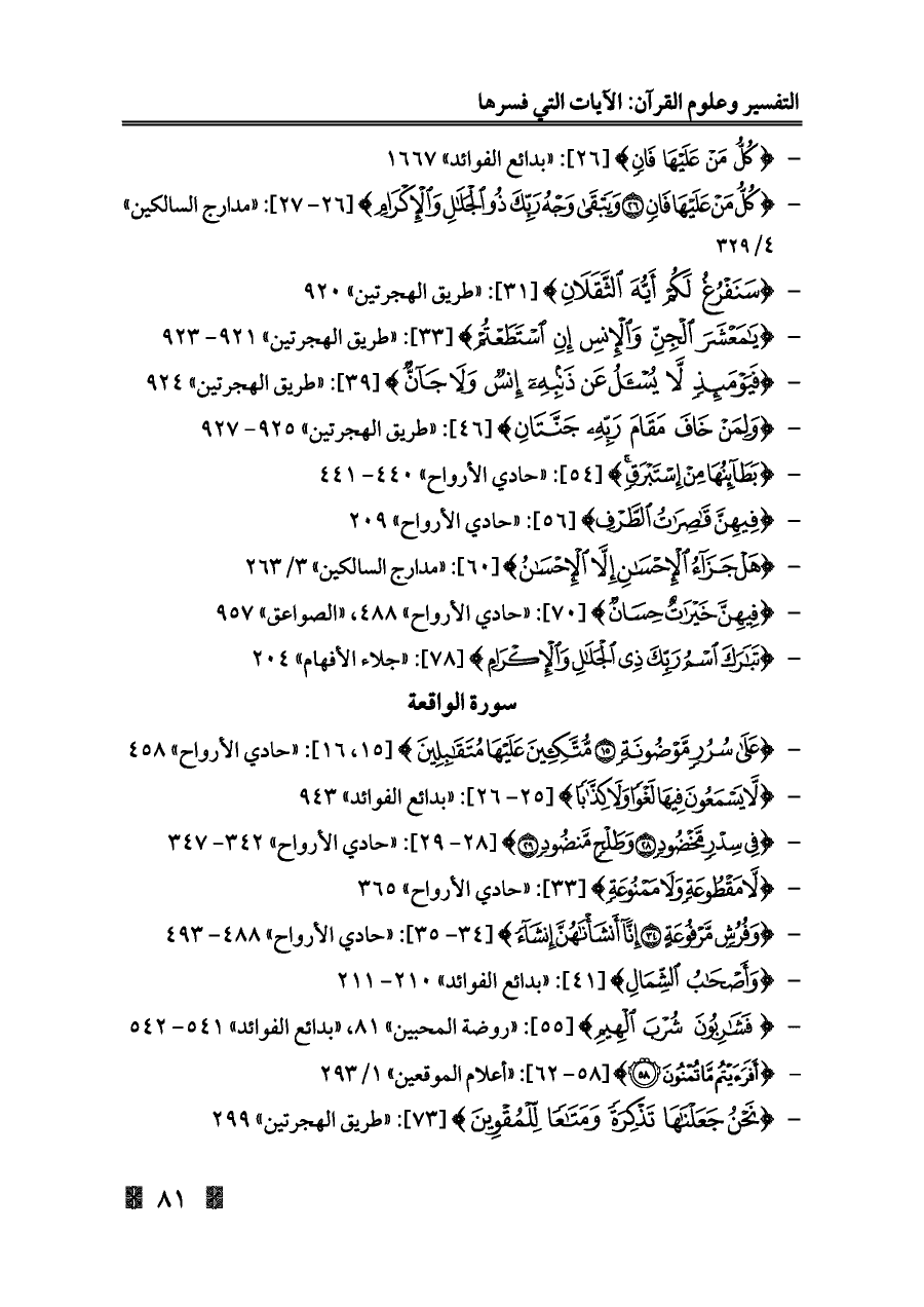 - {كُلُّ مَنْ عَلَيْهَا فَانٍ (٢٦) وَيَبْقَى وَجْهُ رَبِّكَ ذُو الْجَلَالِ وَالْإِكْرَامِ} [٢٦ - ٢٧]: «مدارج السالكين» ٤/ ٣٢٩