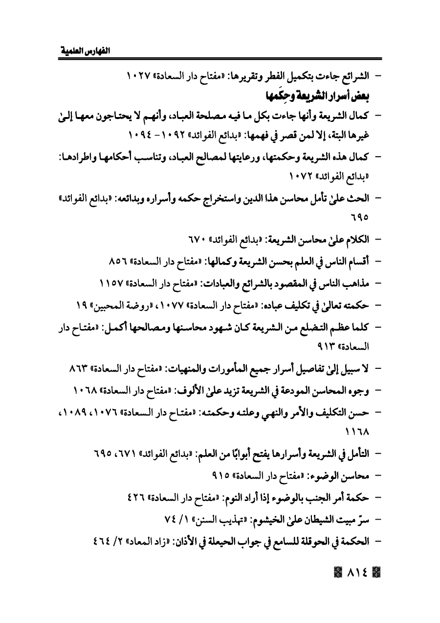- كمال هذه الشريعة وحكمتها، ورعايتها لمصالح العباد، وتناسب أحكامها واطرادها: «بدائع الفوائد» ١٠٧٢