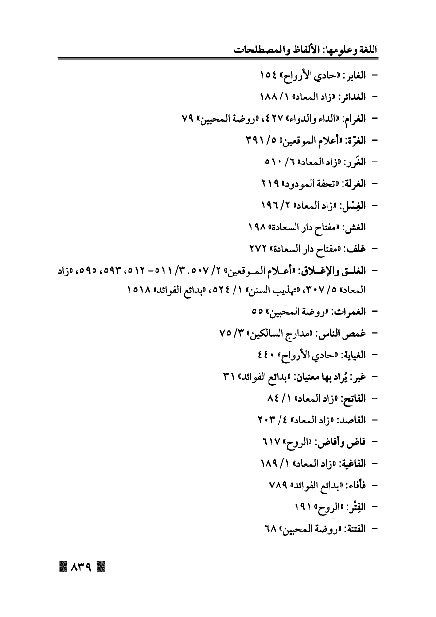 - الغرام: «الداء والدواء» ٤٢٧، «روضة المحبين» ٧٩