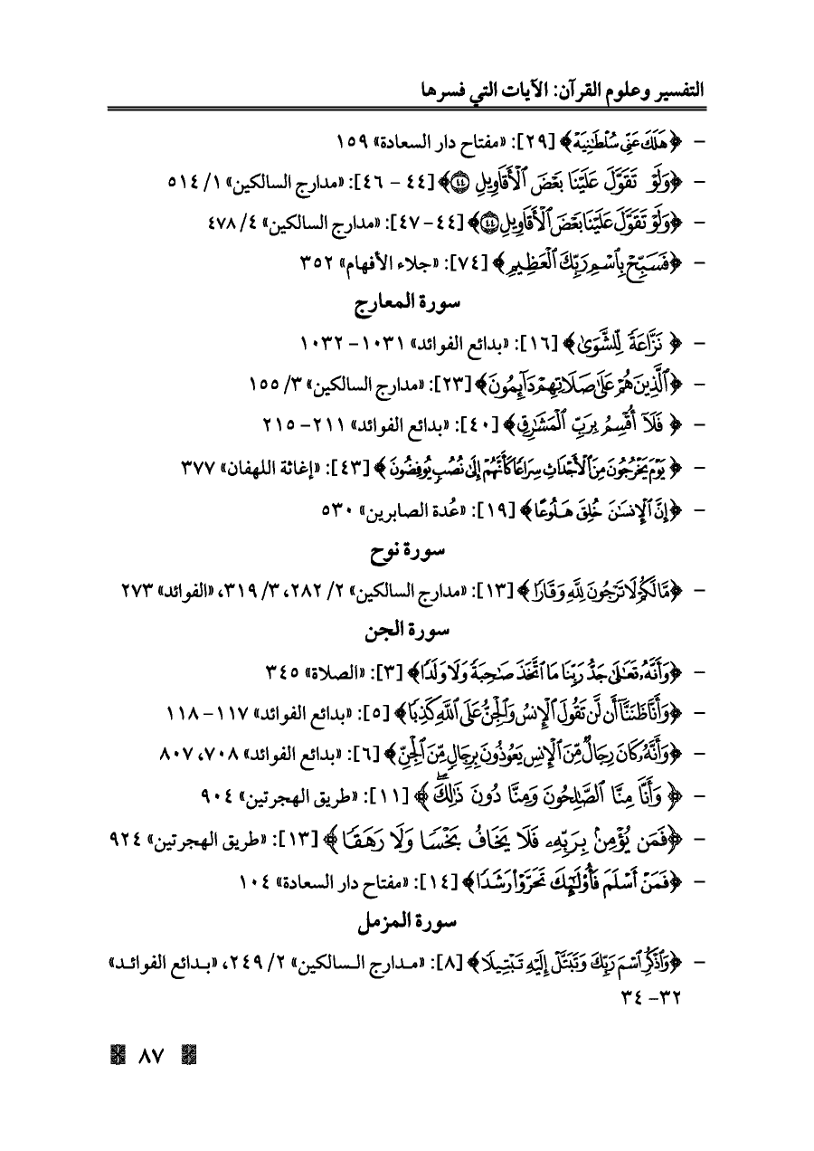 - {وَلَوْ تَقَوَّلَ عَلَيْنَا بَعْضَ الْأَقَاوِيلِ (٤٤)} [٤٤ - ٤٦]: «مدارج السالكين» ١/ ٥١٤