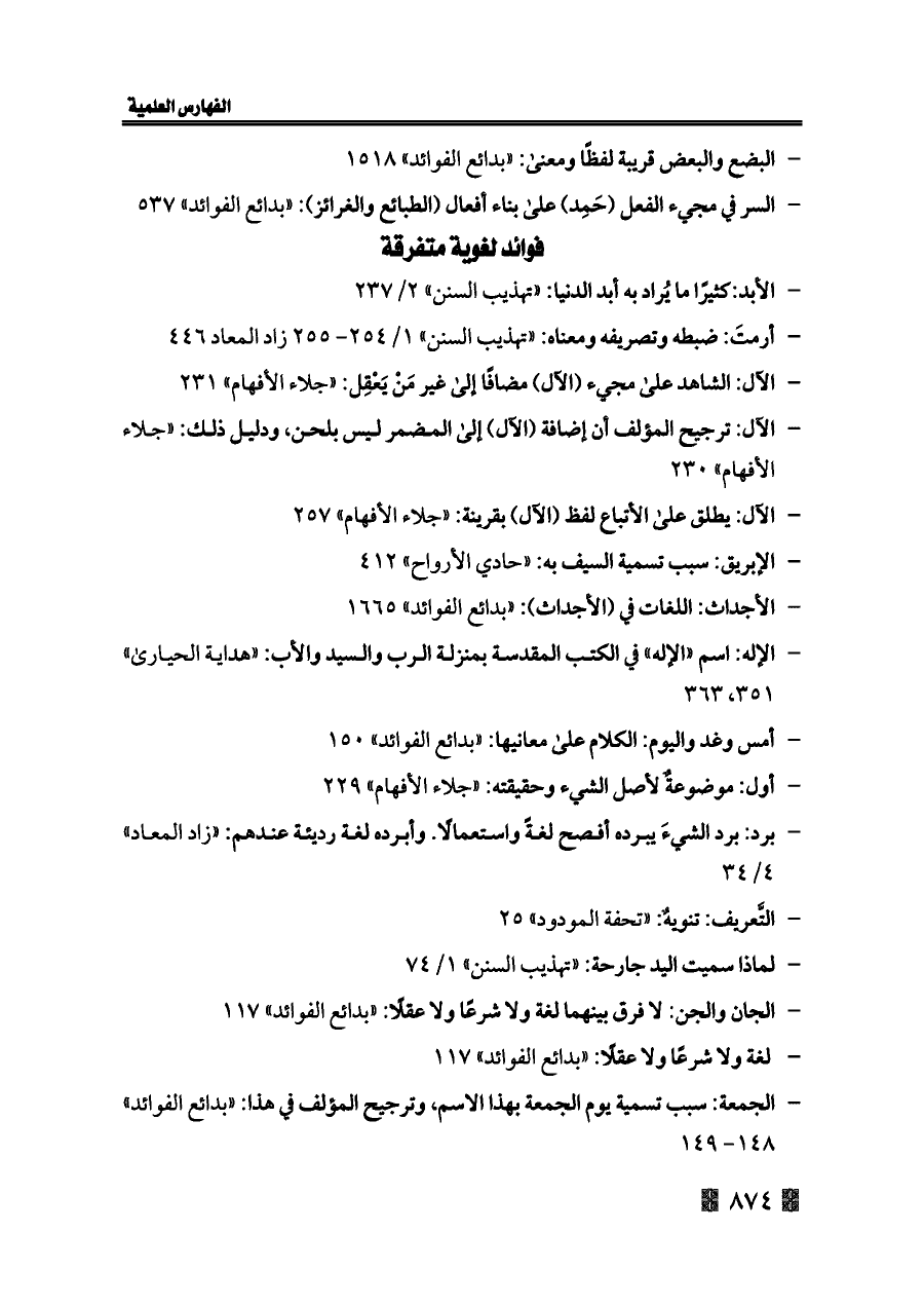 - الجمعة: سبب تسمية يوم الجمعة بهذا الاسم، وترجيح المؤلف في هذا: «بدائع الفوائد» ١٤٨ - ١٤٩