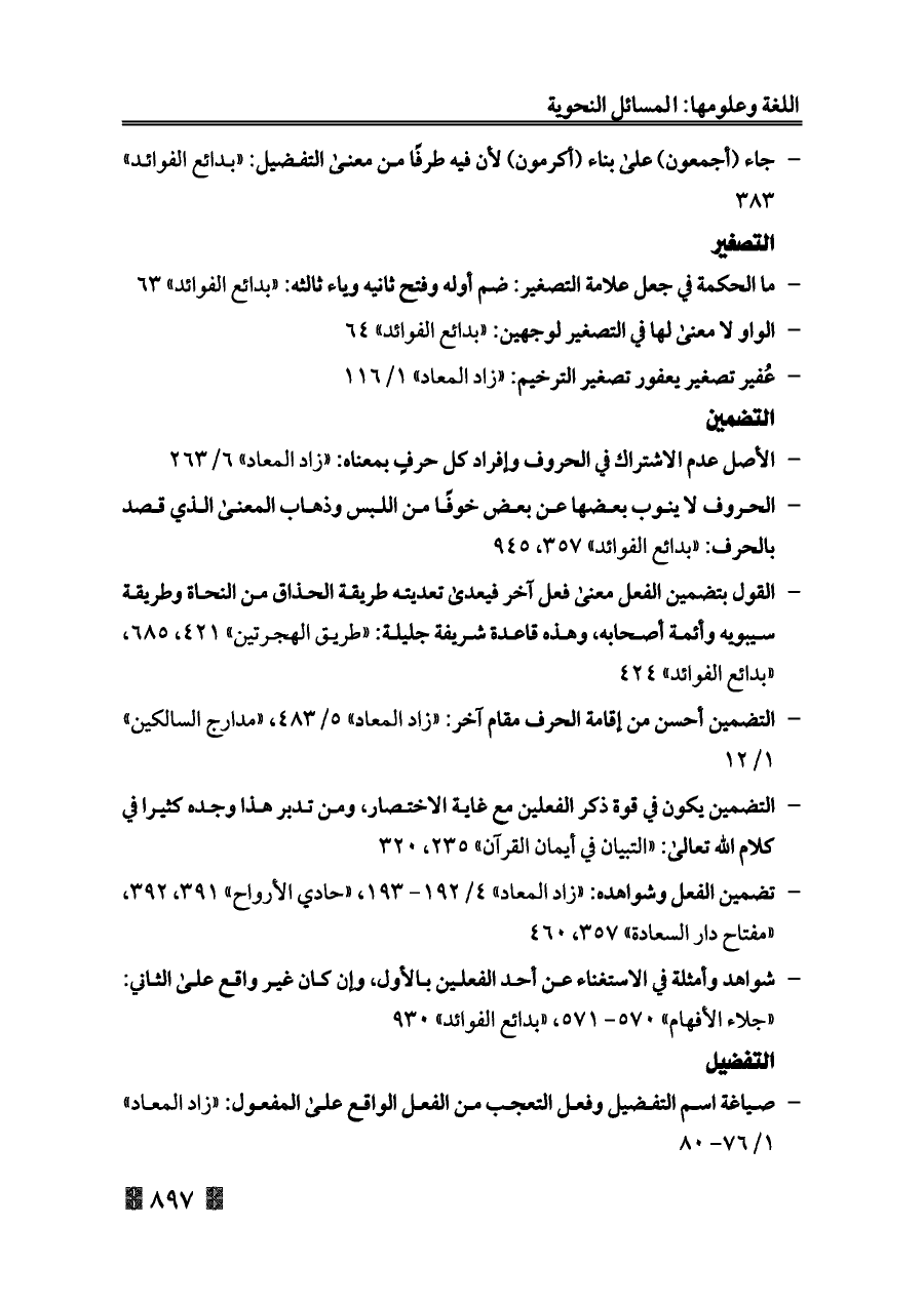 - ما الحكمة في جعل علامة التصغير: ضم أوله وفتح ثانيه وياء ثالثه: «بدائع الفوائد» ٦٣