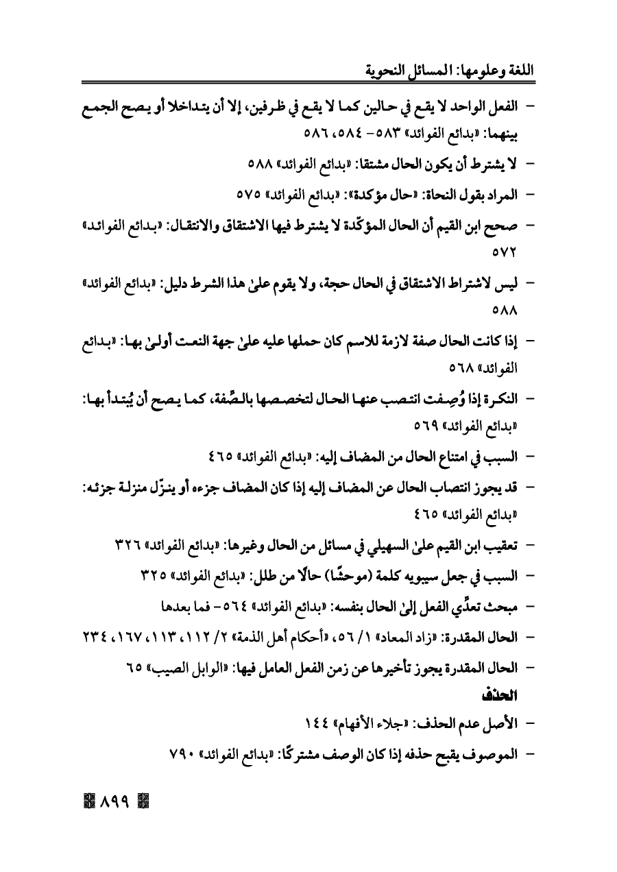 - صحح ابن القيم أن الحال المؤكّدة لا يشترط فيها الاشتقاق والانتقال: «بدائع الفوائد» ٥٧٢