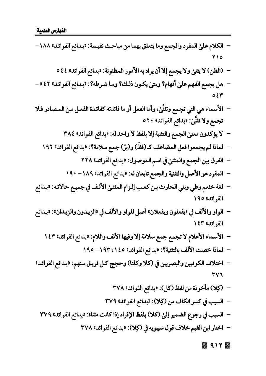 - الكلام على المفرد والجمع وما يتعلق بهما من مباحث نفيسة: «بدائع الفوائد» ١٨٨ - ٢١٥