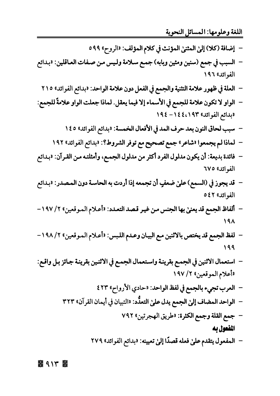 - العلة في ظهور علامة التثنية والجمع في الفعل دون علامة الواحد: «بدائع الفوائد» ٢١٥