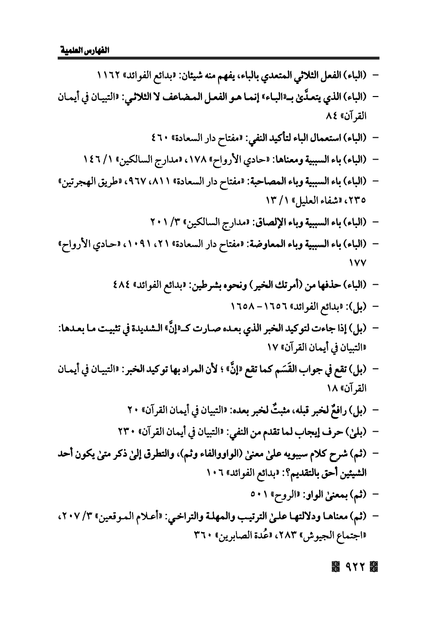 - (الباء) باء السببية وباء المصاحبة: «مفتاح دار السعادة» ٨١١، ٩٦٧، «طريق الهجرتين» ٢٣٥، «شفاء العليل» ١/ ١٣