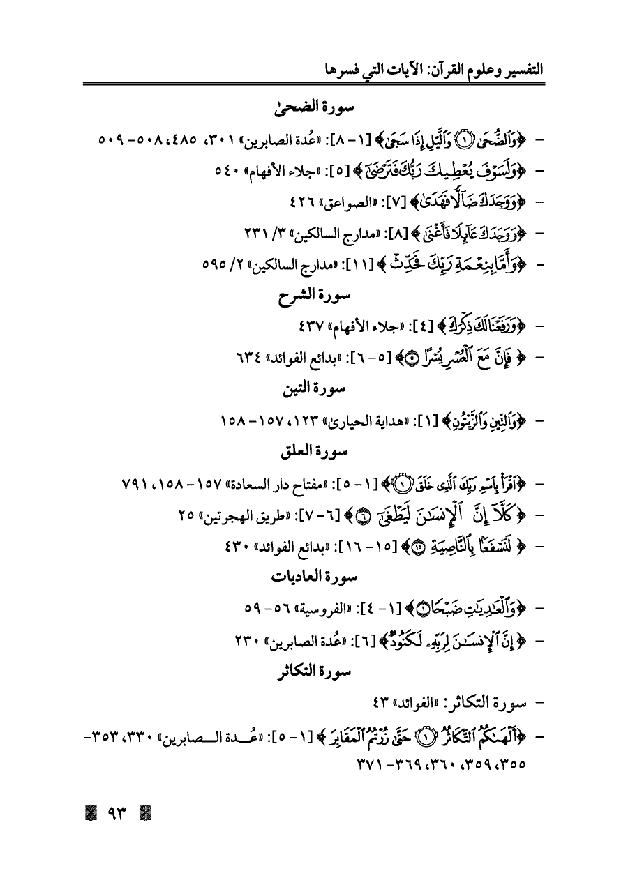 - {وَالضُّحَى (١) وَاللَّيْلِ إِذَا سَجَى} [١ - ٨]: «عُدة الصابرين» ٣٠١، ٤٨٥، ٥٠٨ - ٥٠٩