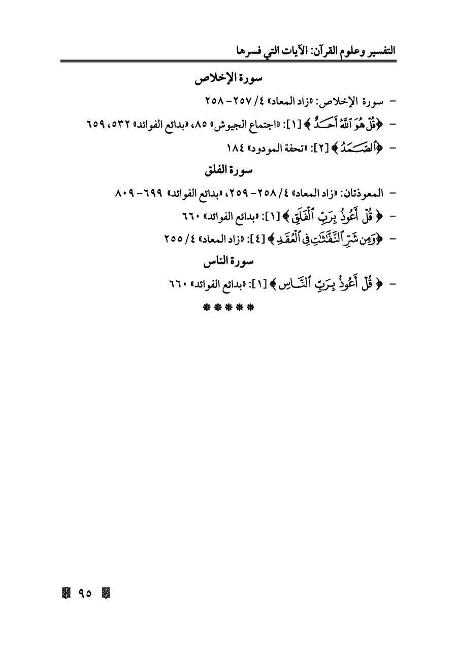 - المعوذتان: «زاد المعاد» ٤/ ٢٥٨ - ٢٥٩، «بدائع الفوائد» ٦٩٩ - ٨٠٩