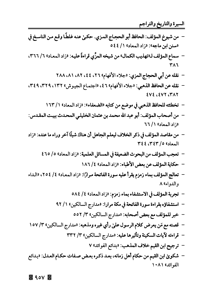 - سماع المؤلف لـ «تهذيب الكمال» من شيخه المزِّي قراءةً عليه: «زاد المعاد» ٦/ ٣٦٦، ٣٨٦