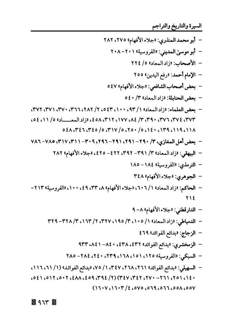 - بعض العلماء: «زاد المعاد» ١/ ٩٣، ١٠٠، ٥٤٣، ٢/ ٢٨٢، ٣٦٦، ٣٧٠، ٣٧١، ٣٧٢، ٣٧٣، ٣٧٤، ٣٧٦، ٣٩٠، ٣/ ٨٤، ١٧٧، ٣١٢، ٤٥٨، «زاد المعاد» ٥/ ١١، ٥٤، ١١٨، ١١٩، ١٣٩، ١٤٠، ٥/ ٢٥٠، ٥/ ٣١٧، ٥/ ٣٤٥، ٣٤٦، ٥٤٨
