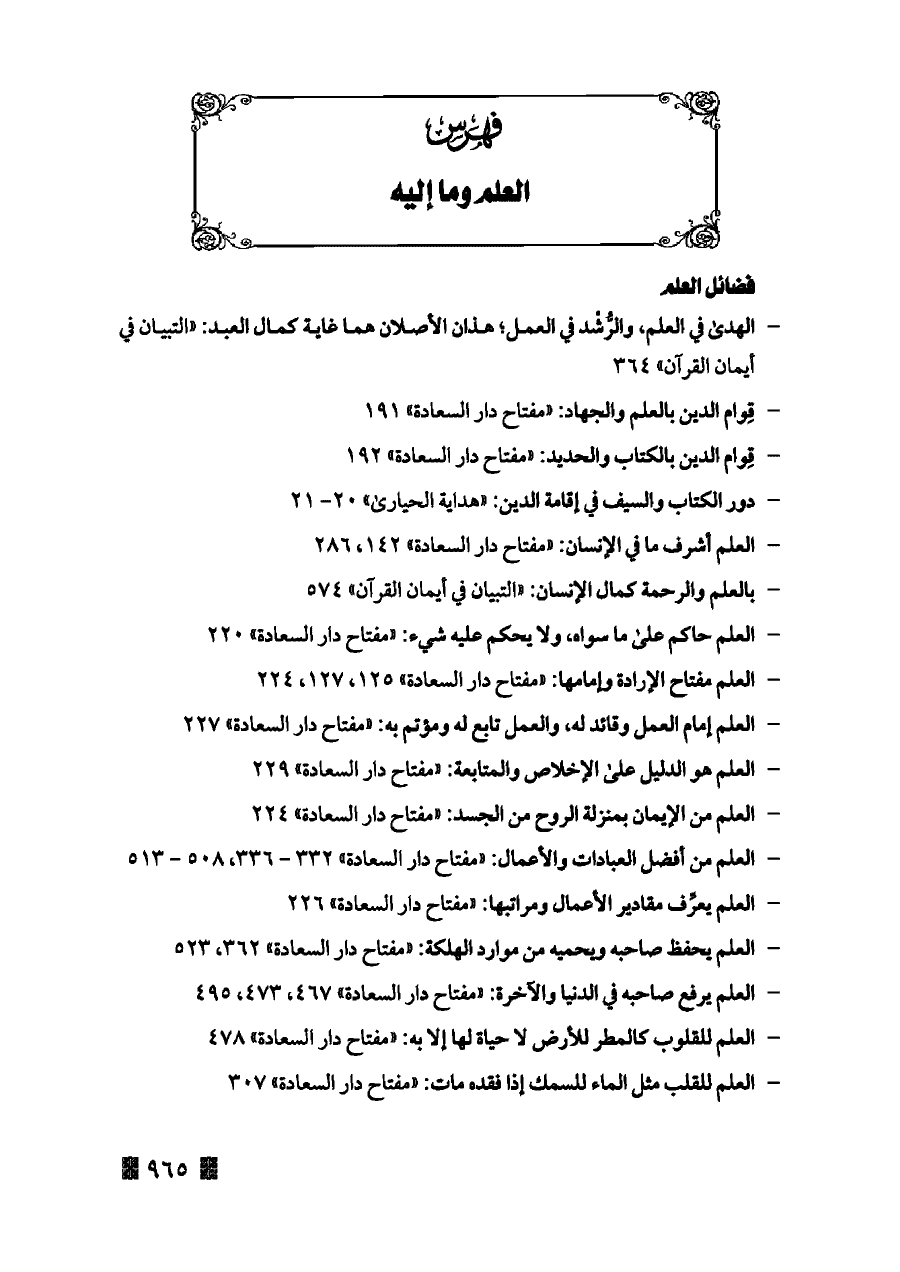 - العلم مفتاح الإرادة وإمامها: «مفتاح دار السعادة» ١٢٥، ١٢٧، ٢٢٤