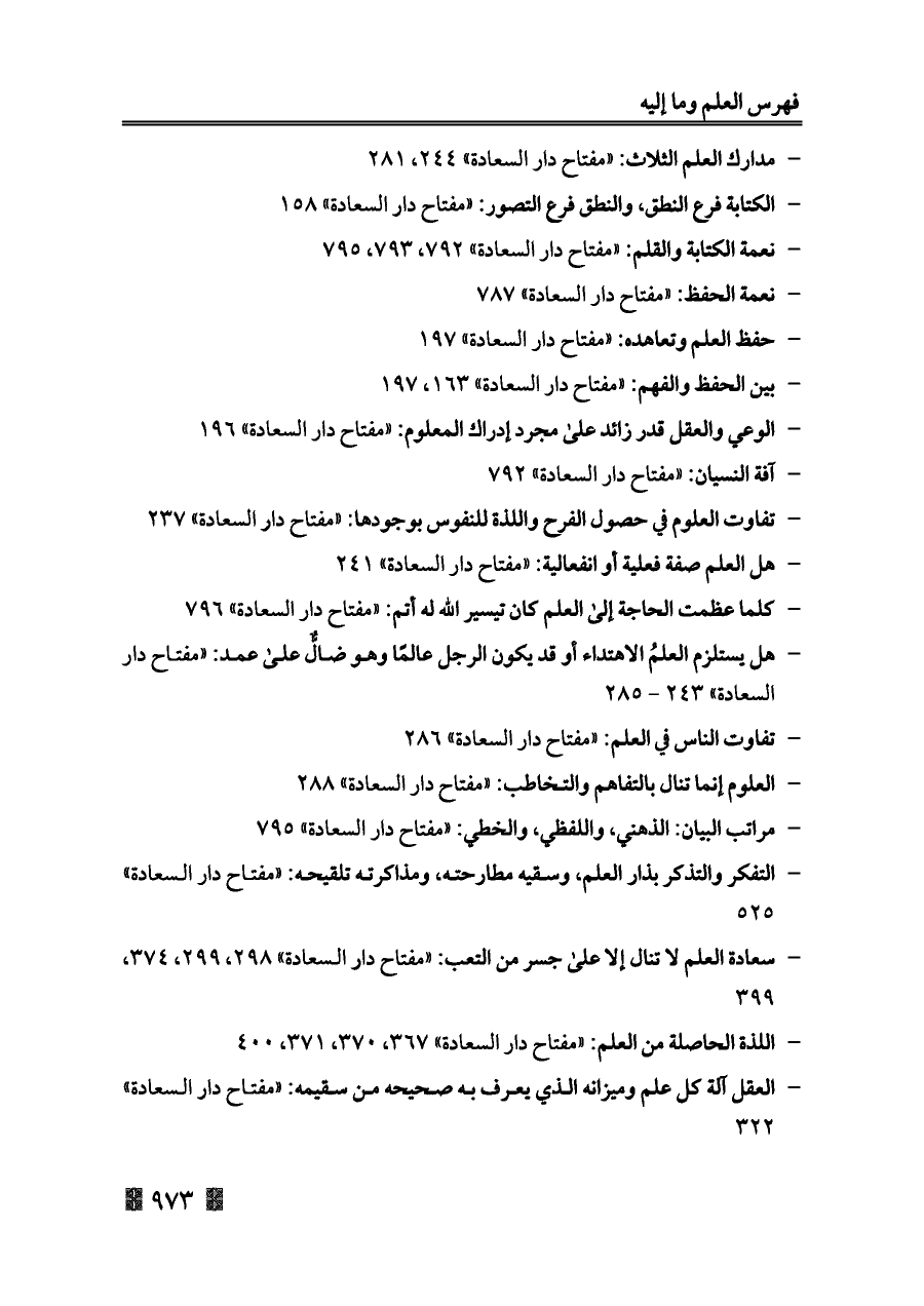 - مدارك العلم الثلاث: «مفتاح دار السعادة» ٢٤٤، ٢٨١