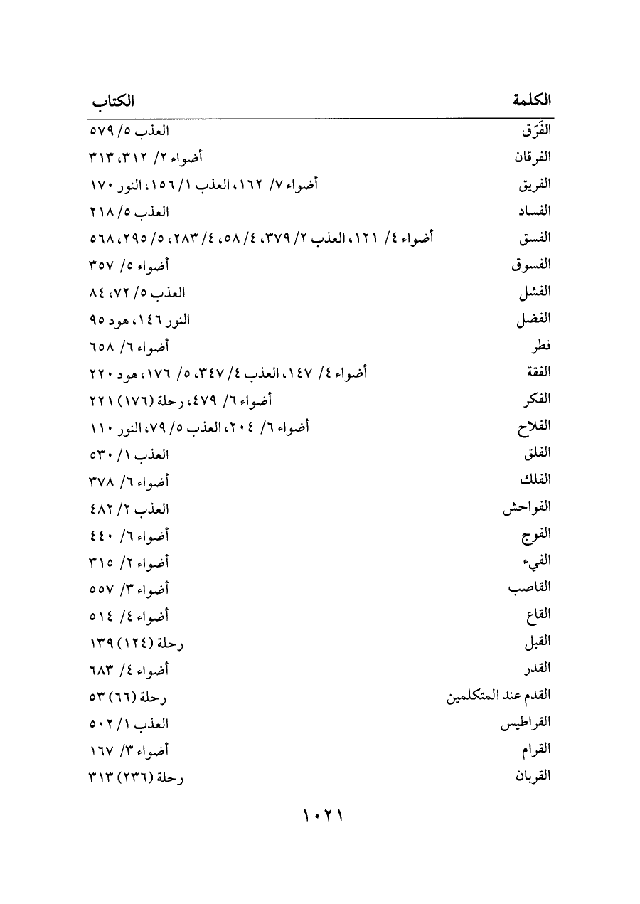 الفسق ... أضواء ٤/ ١٢١، العذب ٢/ ٣٧٩، ٤/ ٥٨، ٤/ ٢٨٣، ٥/ ٢٩٥، ٥٦٨