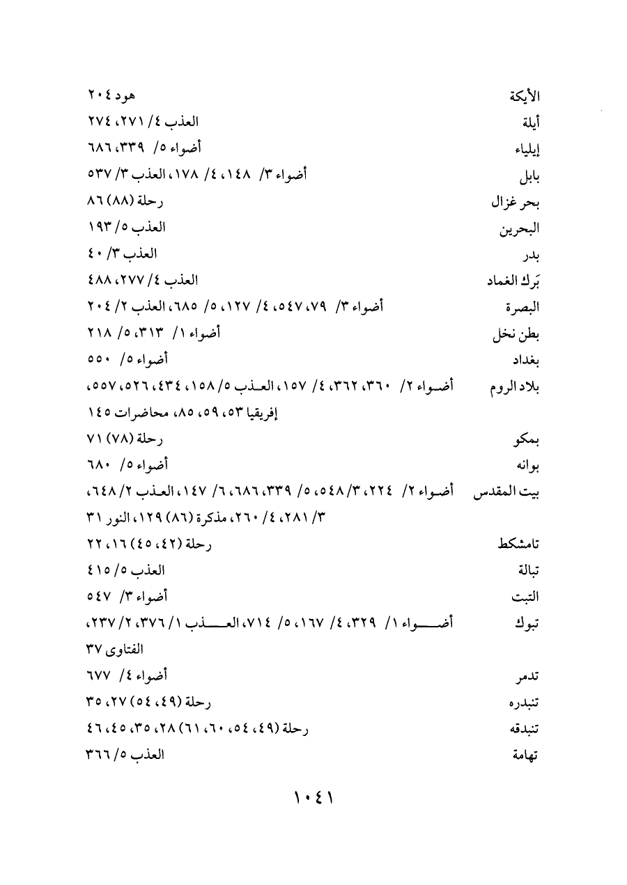 بيت المقدس ... أضواء ٢/ ٢٢٤، ٣/ ٥٤٨، ٥/ ٣٣٩، ٦٨٦، ٦/ ١٤٧، العذب ٢/ ٦٤٨، ٣/ ٢٨١، ٤/ ٢٦٠، مذكرة (٨٦) ١٢٩، النور ٣١